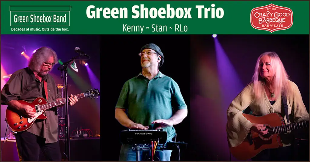 Green Shoebox Band members will be performing a series of concerts for our favorite BBQ Restaurant. The trio of RLo, Stan and Kenny will play your favorite songs from the 60s through the 2000s while you enjoy great BBQ and variety of drinks.