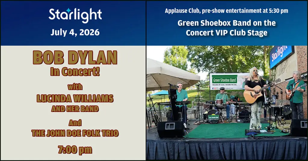 Green Shoebox Band is thrilled to be returning to Starlight Theatre to provide the pre-show entertainment for a special evening. We will perform favorite songs from the 60s through 2000s starting at 5:30 on the Applause Club VIP Concert Stage.About the show: Bob Dylan - with Lucinda Williams and her band & John Doe Folk Trio […]